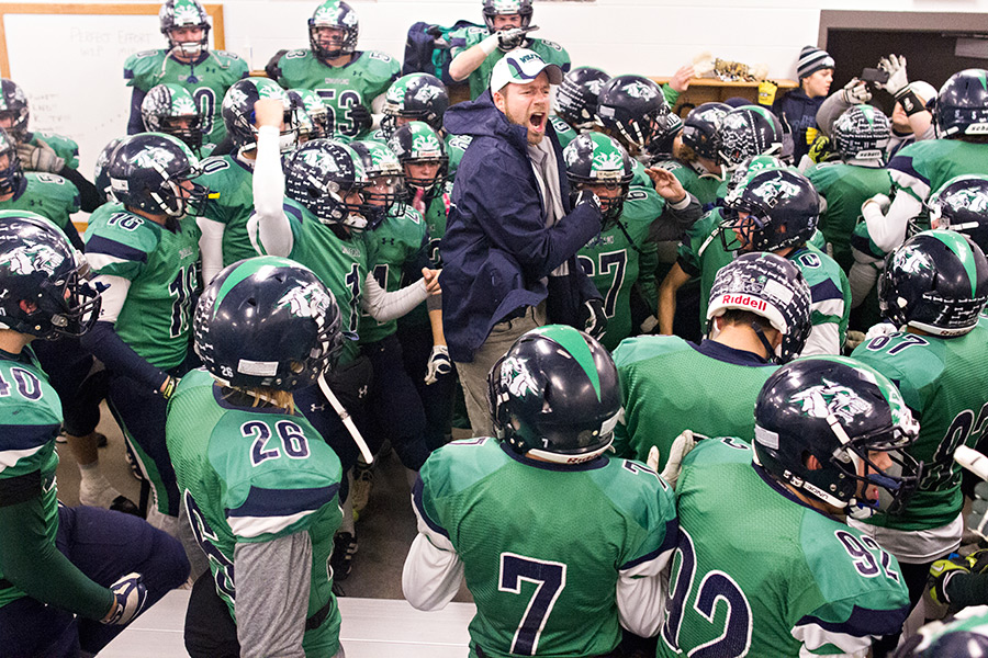 Head coach Grady Bennett pumps up his team in the locker room before the game. Kalispell Glacier defeated Great Falls CMR 56-19 in the Class AA state championship game on Nov. 21, 2014. For more photos visit www.FlatheadBeacon.com. Greg Lindstrom | Flathead Beacon
