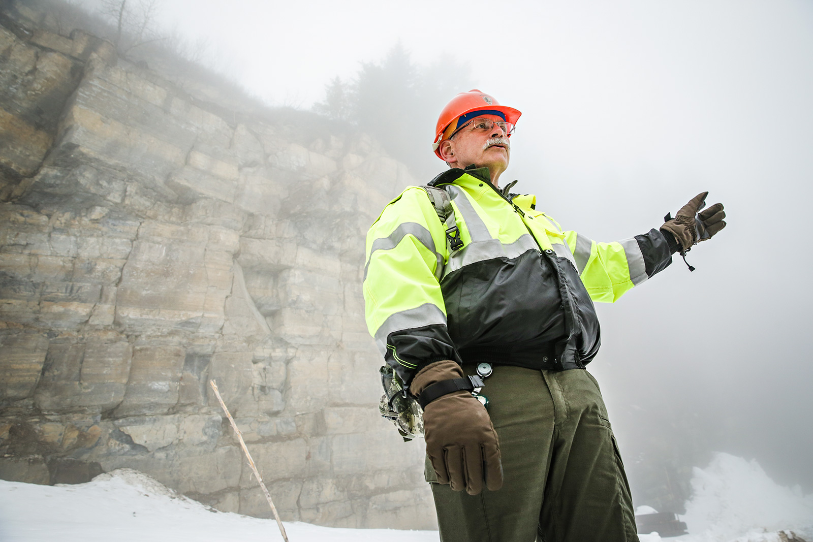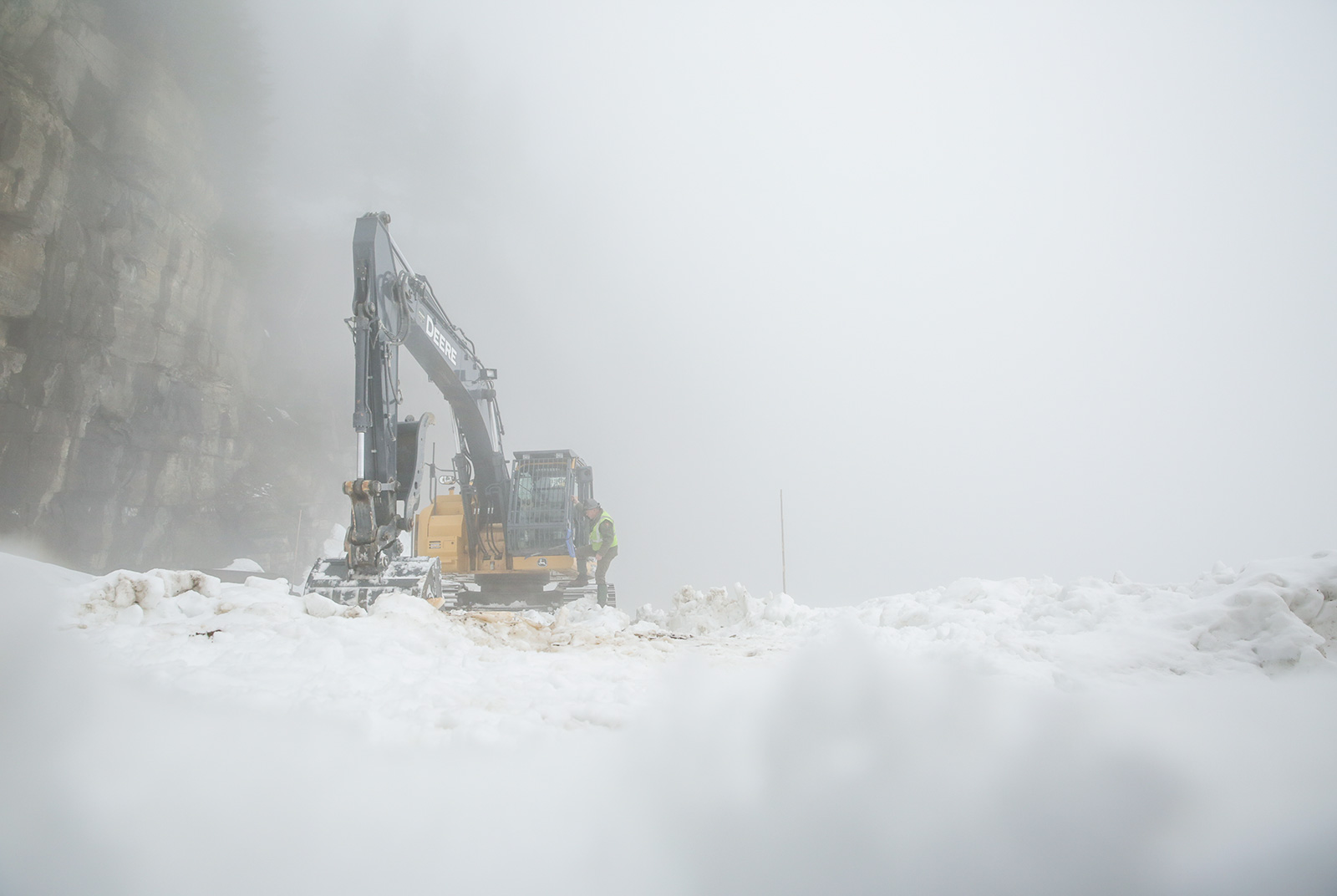 A heavy equipment operator exits an excavator as heavy fog rolls in over Going-to-the-Sun Road in Glacier National Park on April 24, 2023. Hunter D’Antuono | Flathead Beacon