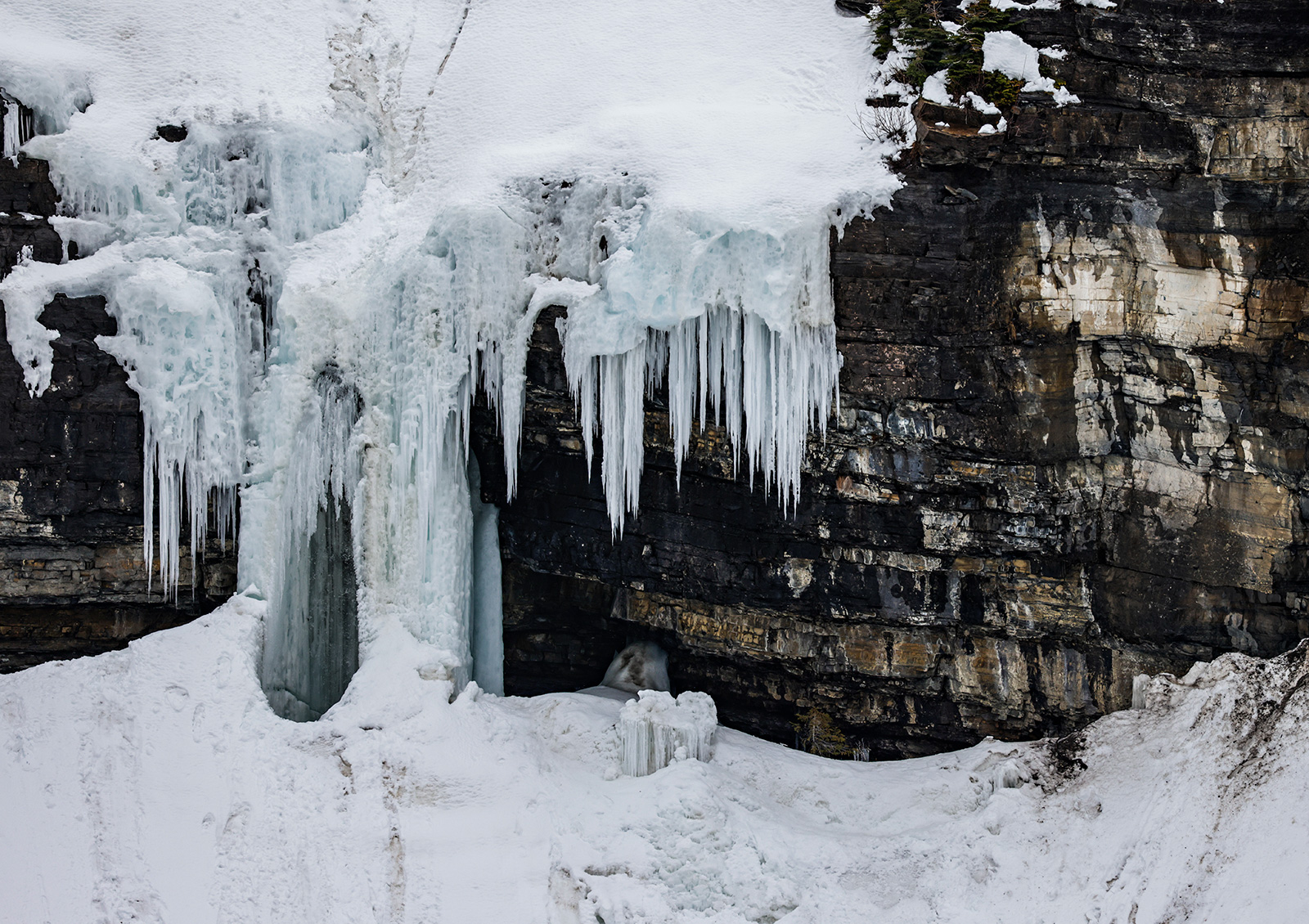 Ice from a frozen Haystack Creek Falls clings to rock faces along Going-to-the-Sun Road in Glacier National Park on April 24, 2023. Hunter D’Antuono | Flathead Beacon