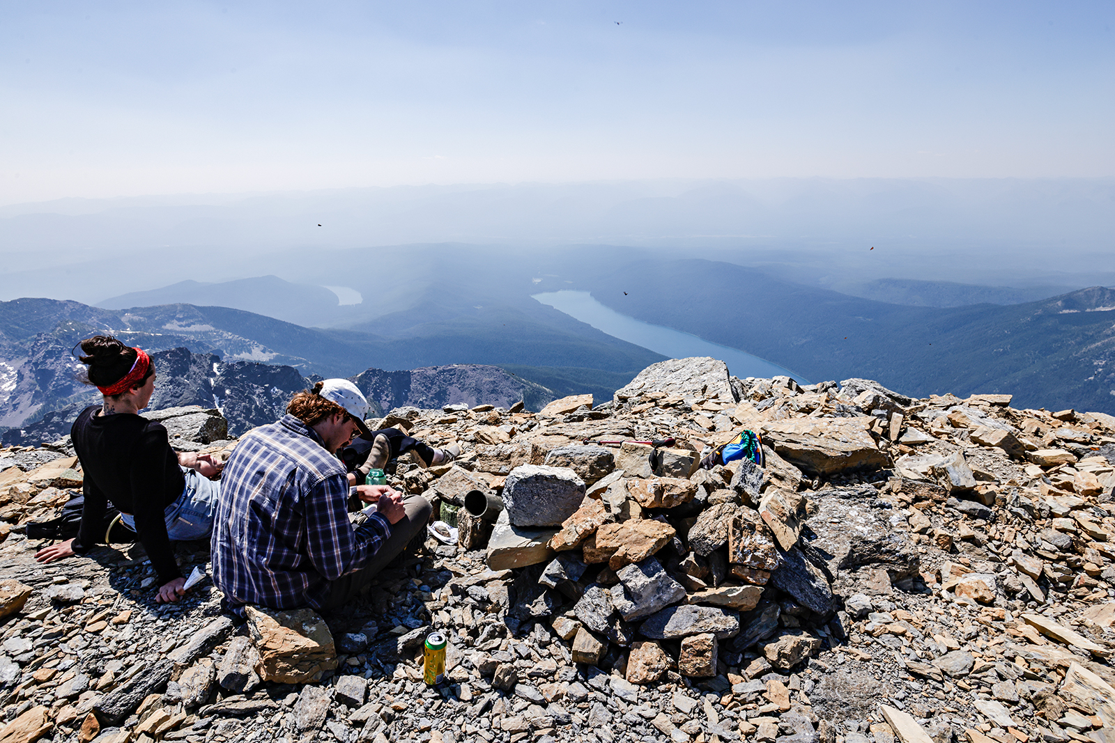 Hikers take in views of Bowman Lake from the summit of Rainbow Peak in Glacier National Park on July 8, 2025. Hunter D’Antuono | Flathead Beacon
