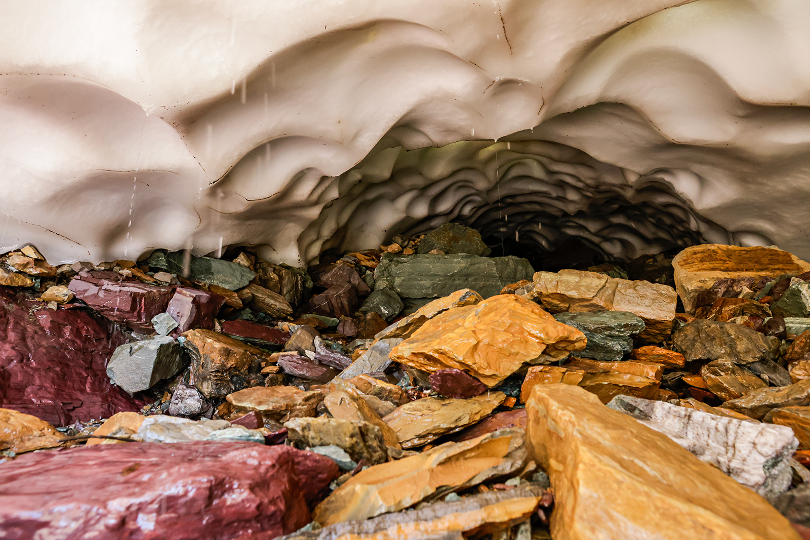 A melting snow cavern in a gully on the slopes of Rainbow Peak in Glacier National Park on July 8, 2025. Hunter D’Antuono | Flathead Beacon