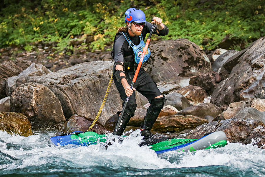 Jimmy Reed of Whitefish paddle boards through a rapid on the Middle Fork of the Flathead River near Belton Bridge in West Glacier. Hunter D’Antuono | Flathead Beacon