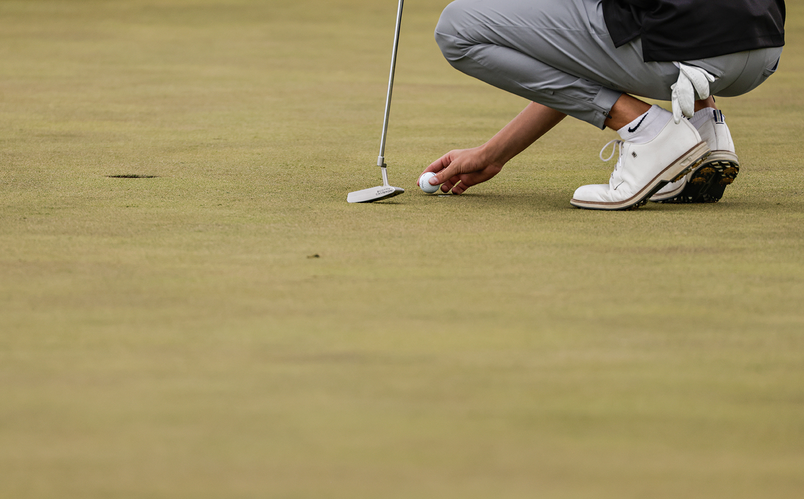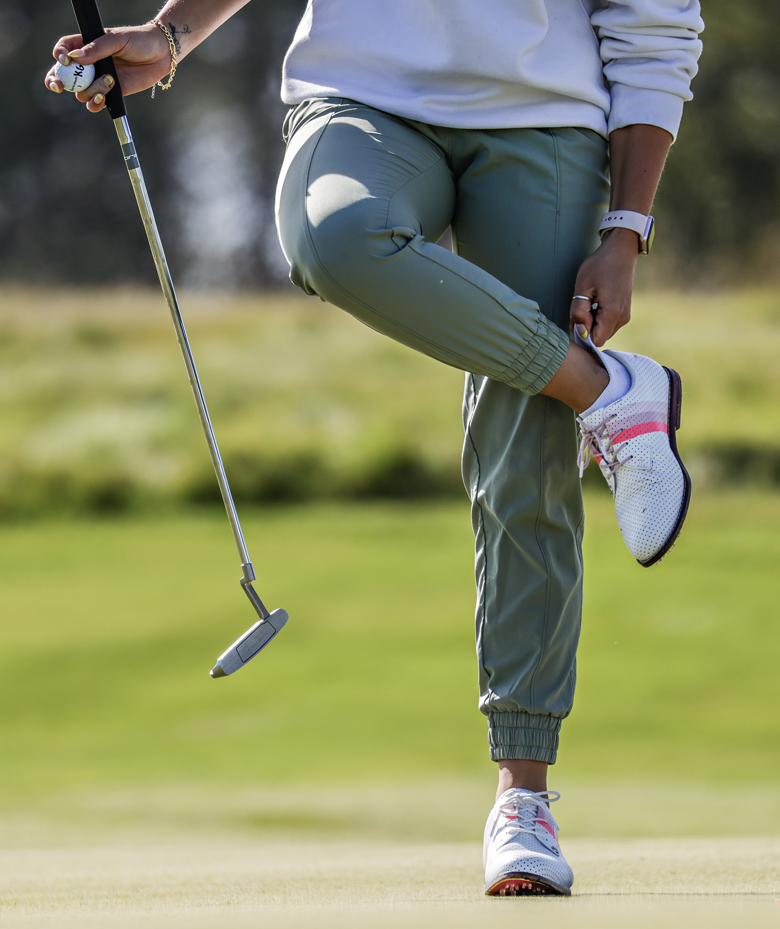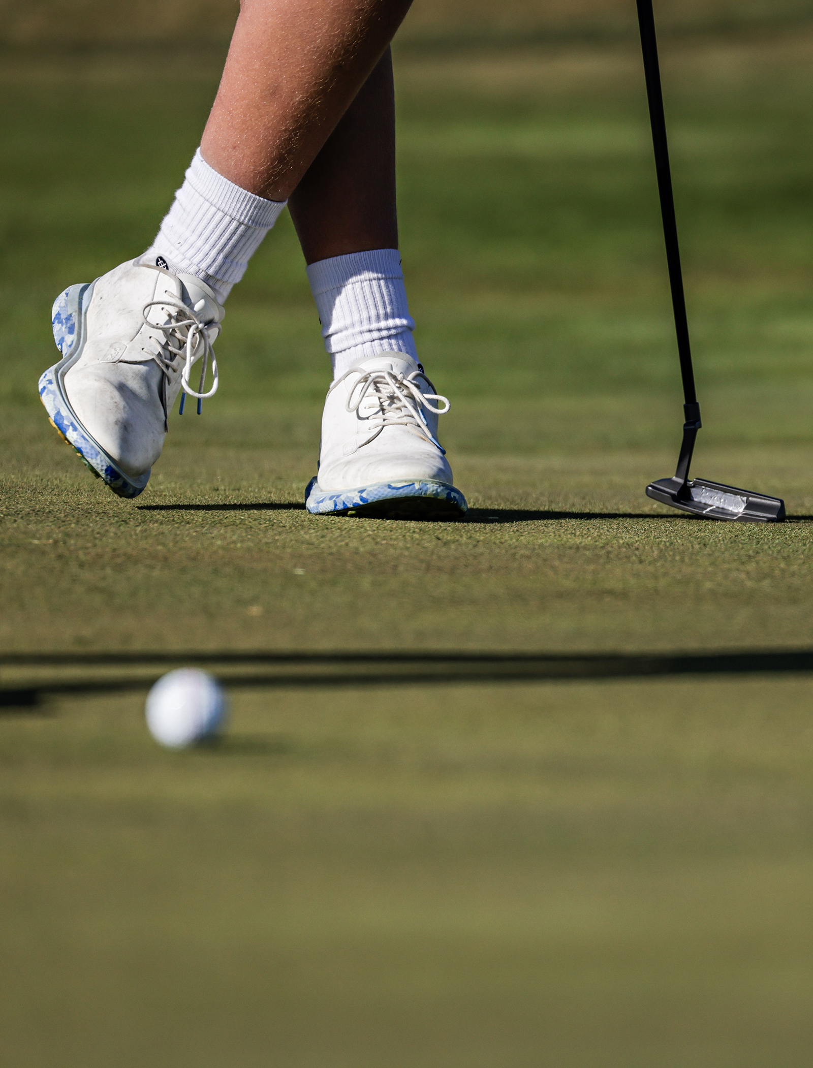 A golfer adjusts her sock on the green during the Class AA State Golf Tournament at Northern Pines Golf Club in Kalispell on Oct. 3, 2024. Hunter D’Antuono | Flathead Beacon