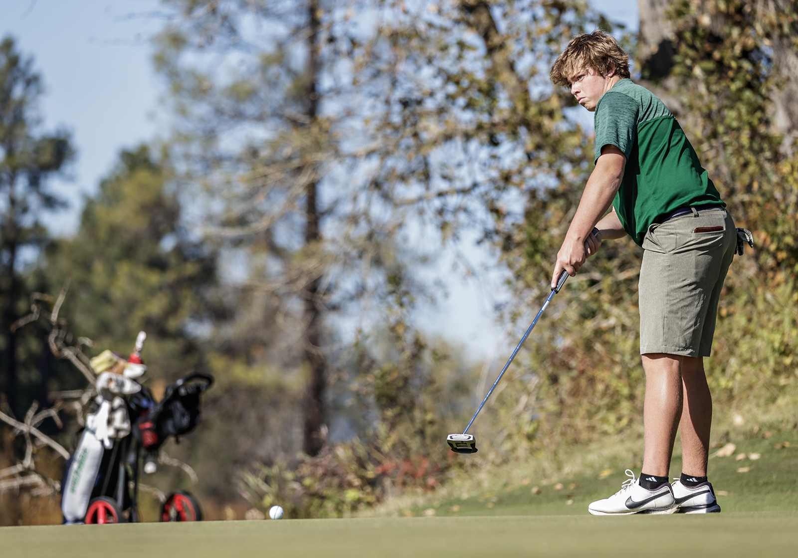 Tanyon Murray of Glacier High School putts during the Class AA State Golf Tournament at Northern Pines Golf Club in Kalispell on Oct. 3, 2024. Hunter D’Antuono | Flathead Beacon