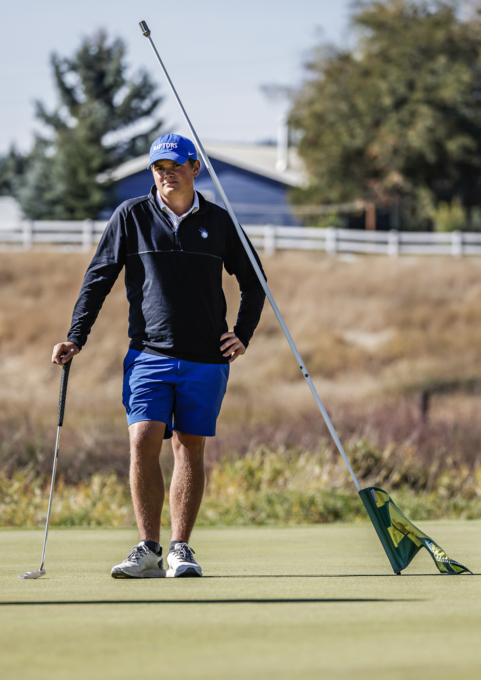 Cobe Sacry of Gallatin High School holds a flagstick during the Class AA State Golf Tournament at Northern Pines Golf Club in Kalispell on Oct. 3, 2024. Hunter D’Antuono | Flathead Beacon