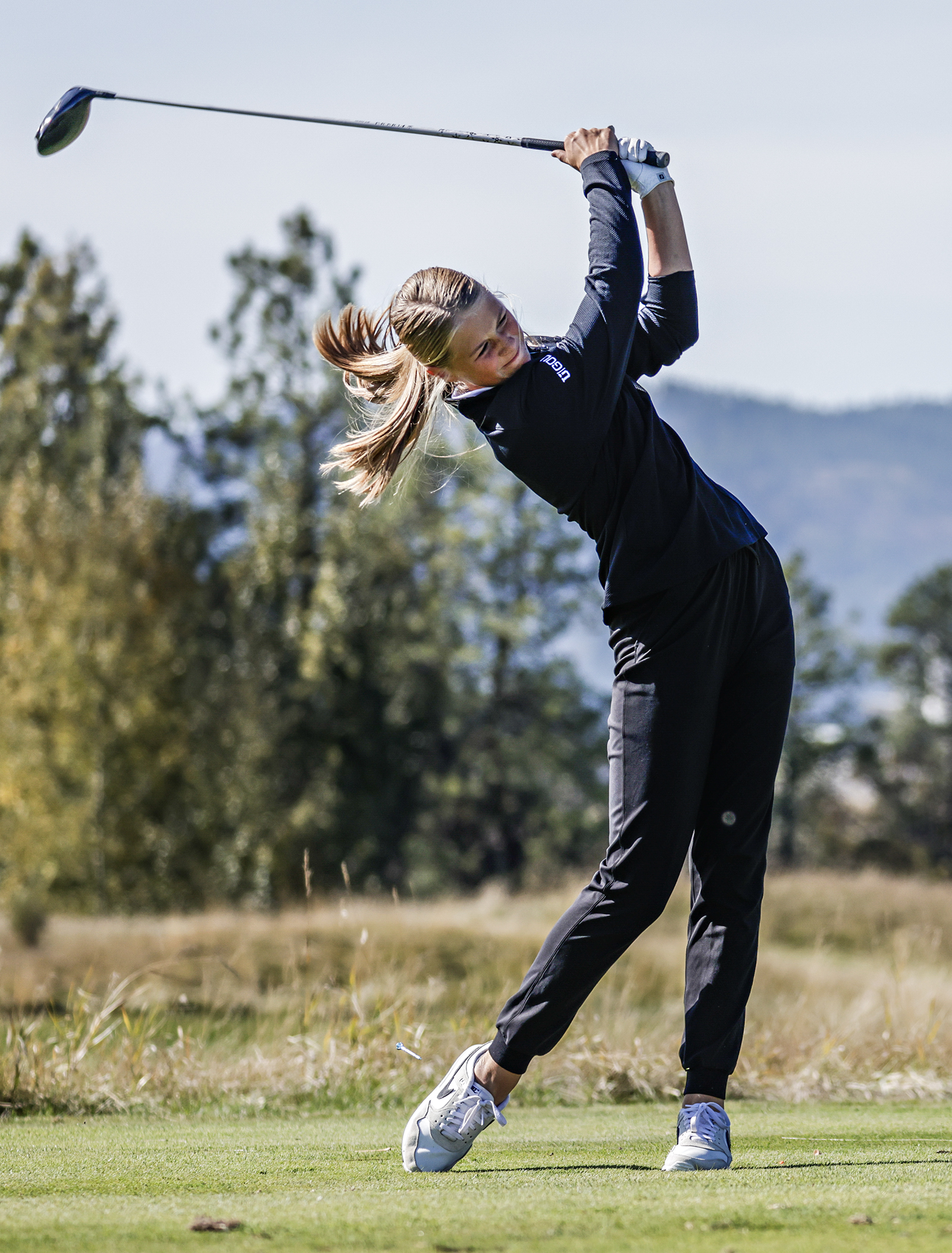 Kyrie Gislason of Flathead High School tees off during the Class AA State Golf Tournament at Northern Pines Golf Club in Kalispell on Oct. 3, 2024. Hunter D’Antuono | Flathead Beacon