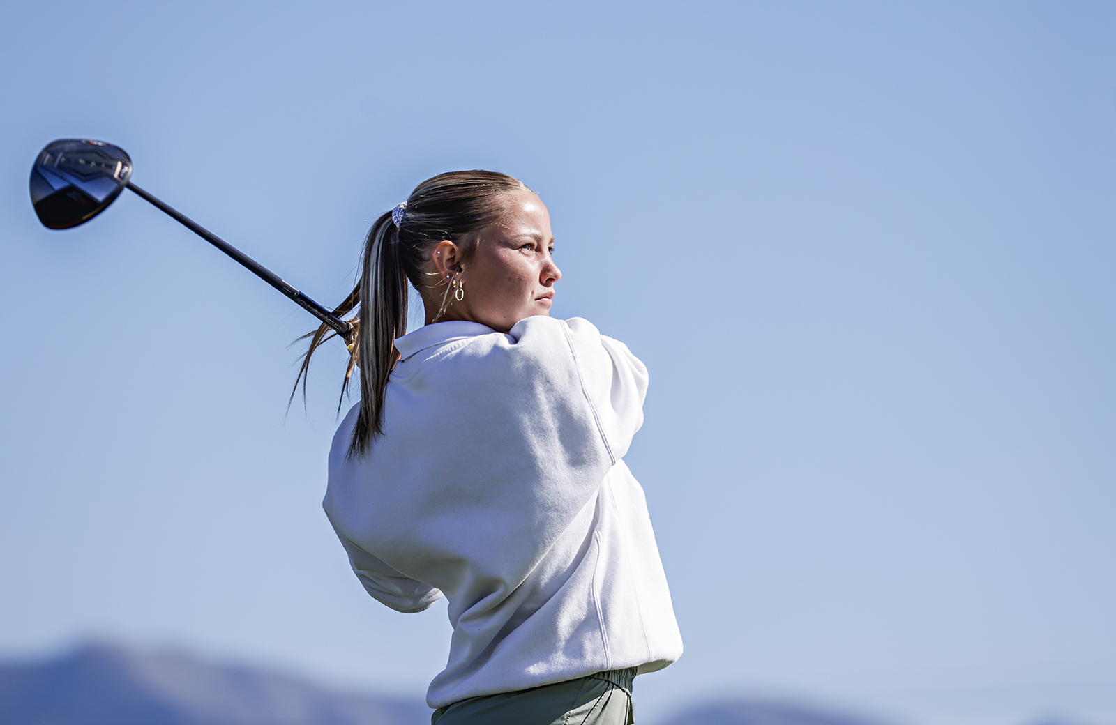 Addison Bleile of Gallatin High School tees off during the Class AA State Golf Tournament at Northern Pines Golf Club in Kalispell on Oct. 3, 2024. Hunter D’Antuono | Flathead Beacon