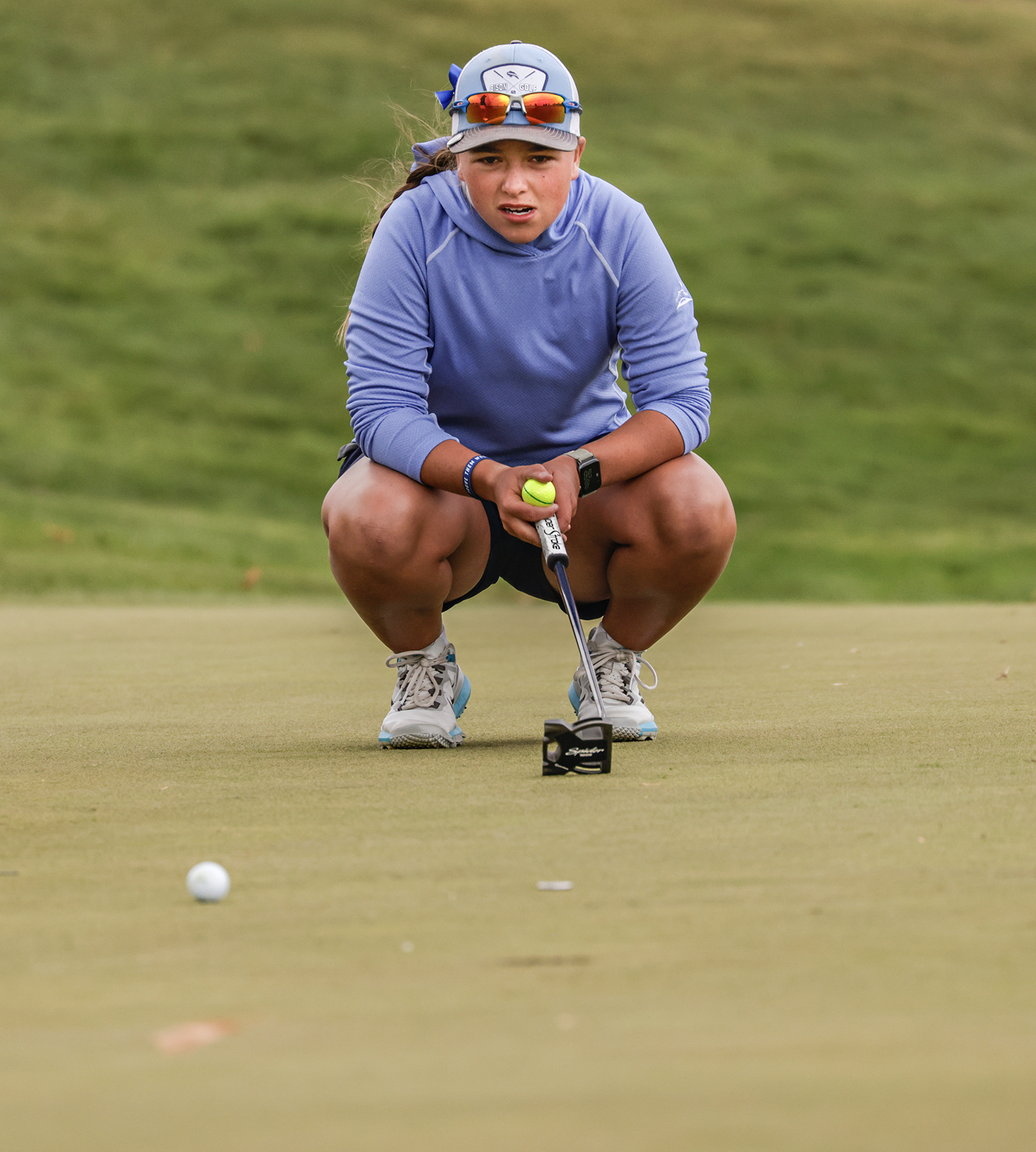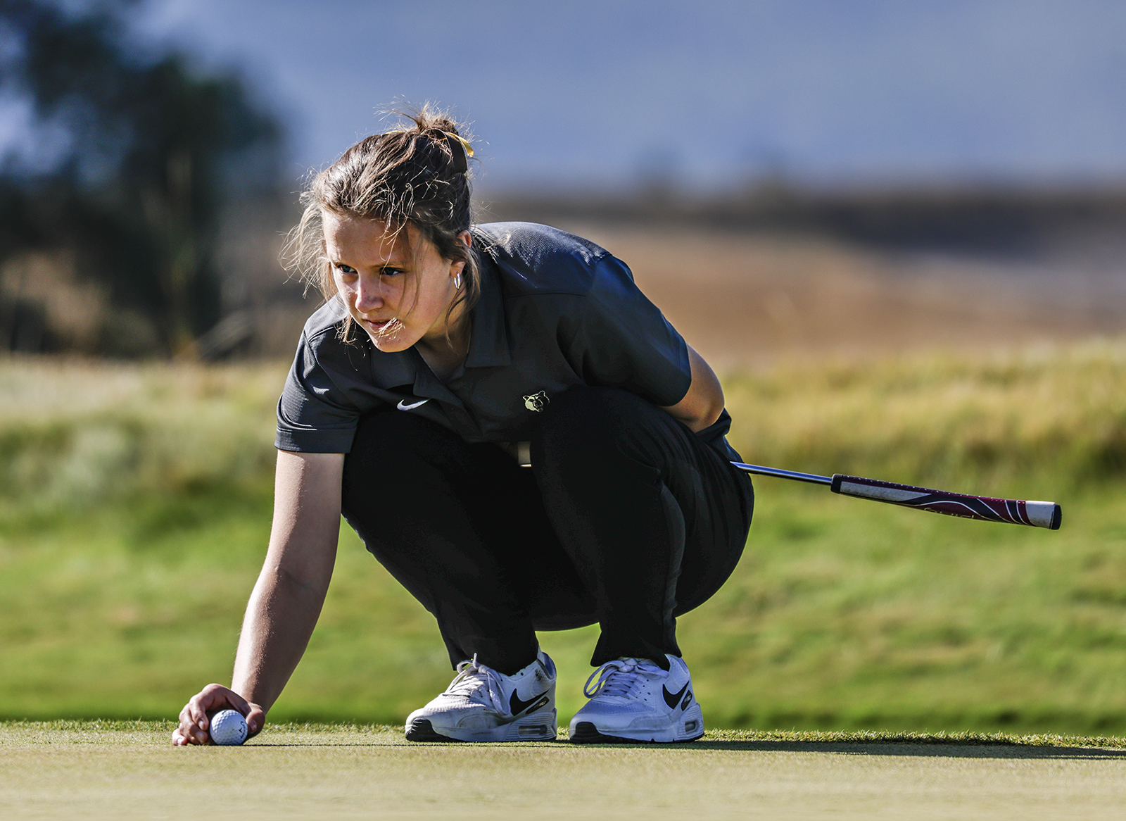 Hanna Boyd of Great Falls High School crouches on the green at the Class AA State Golf Tournament at Northern Pines Golf Club in Kalispell on Oct. 4, 2024. Washington placed first. Hunter D’Antuono | Flathead Beacon