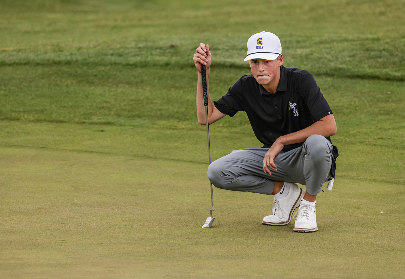 Hudson Goroski of Sentinel High School, boy’s winner of the Class AA State Golf Tournament, crouches on the green ahead of his final putts at Northern Pines Golf Club in Kalispell on Oct. 4, 2024. Hunter D’Antuono | Flathead Beacon