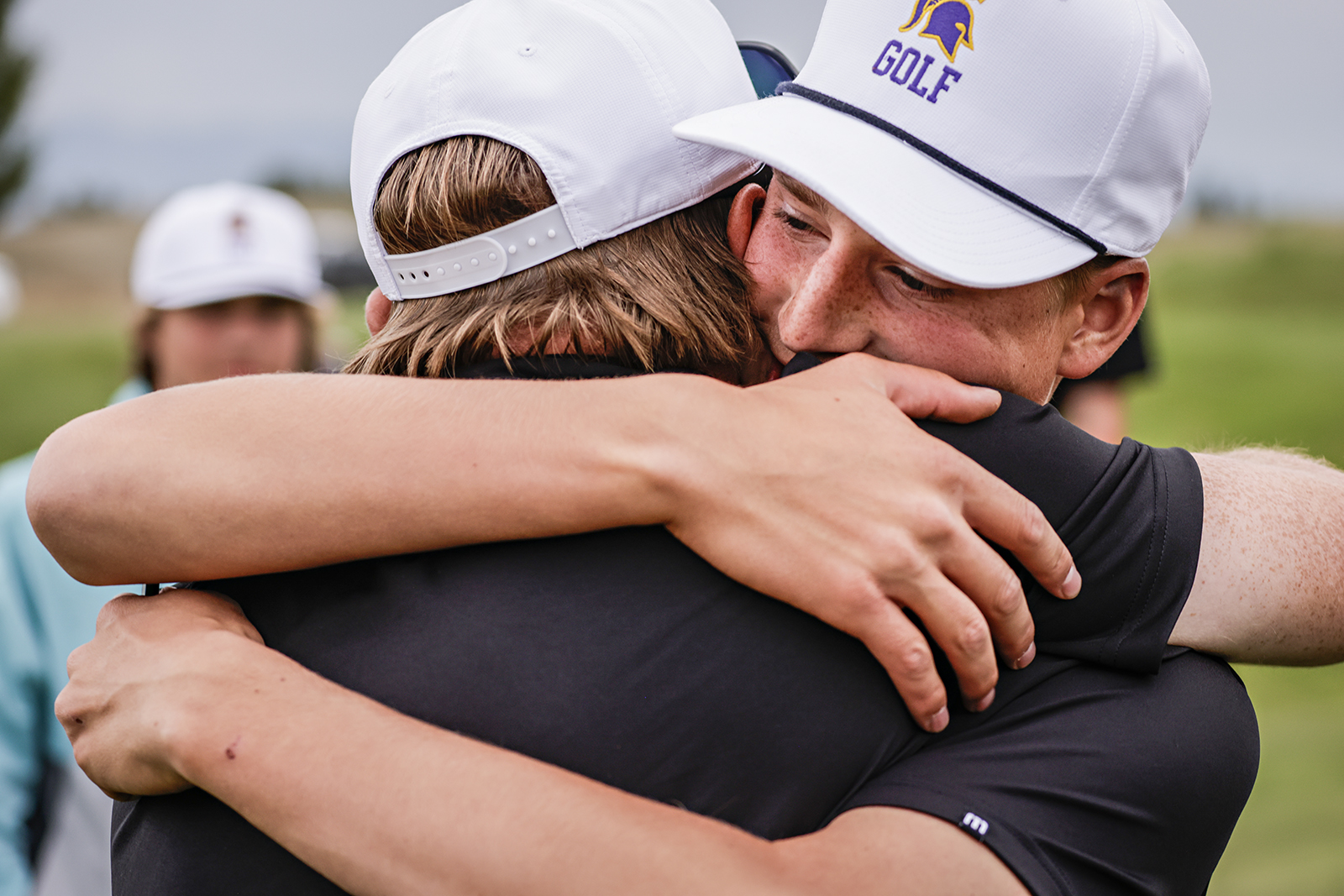 Hudson Goroski of Sentinel High School, boy’s winner of the Class AA State Golf Tournament, embraces his teammates at Northern Pines Golf Club in Kalispell on Oct. 4, 2024. Hunter D’Antuono | Flathead Beacon