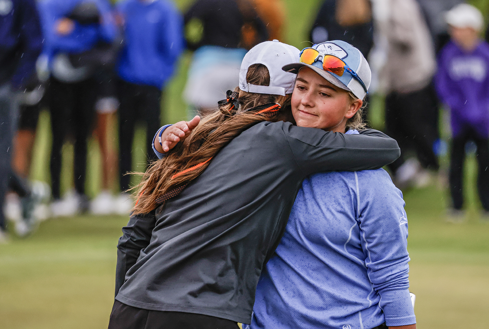 Becca Washington of Billings Senior High School, left, and Hanna Boyd of Great Falls High School embrace after Washington edged out Boyd for first for the girl’s Class AA State Golf title at Northern Pines Golf Club in Kalispell on Oct. 4, 2024. Hunter D’Antuono | Flathead Beacon