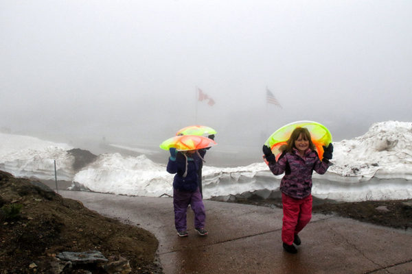 20180623_GNP_SUNROAD_243 By Justin Franz June 23, 2018 Evie, Meia and Synthea Freiheit take their sleds up the hill at Logan Pass on June 23. Justin Franz | Flathead Beacon
