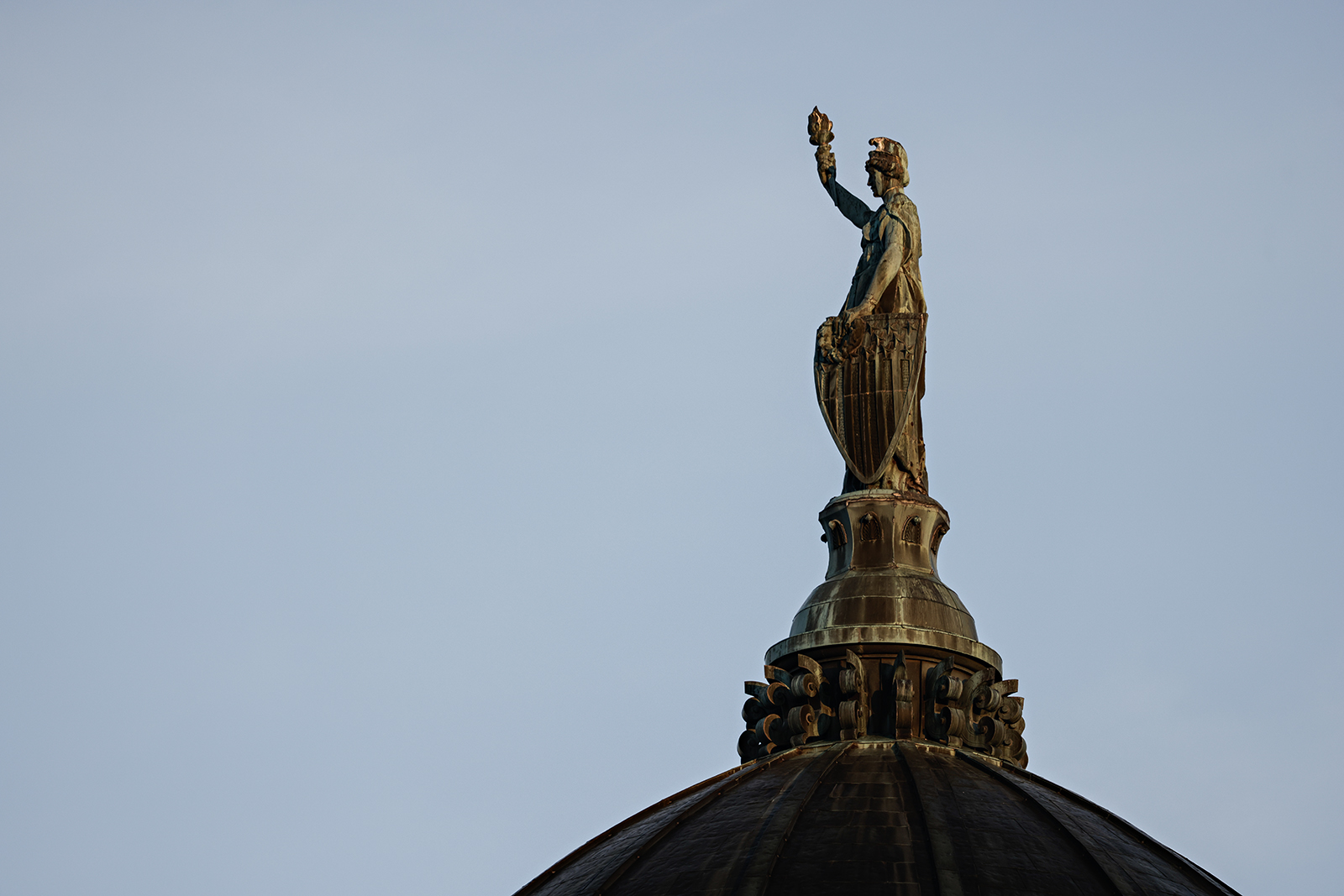 The final sunbeams of day fade from the “Montana” statue atop the dome of the Capitol in Helena on Jan. 15, 2025. Hunter D’Antuono | Flathead Beacon