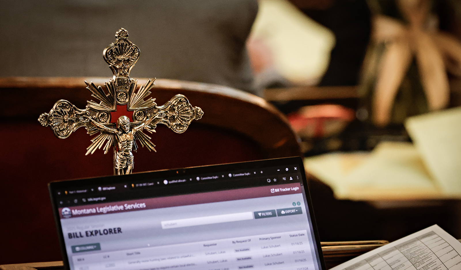 A crucifix stands on the desk of Rep. Lukas Schubert on the House Floor in the Capitol in Helena on Jan. 16, 2025. Hunter D’Antuono | Flathead Beacon