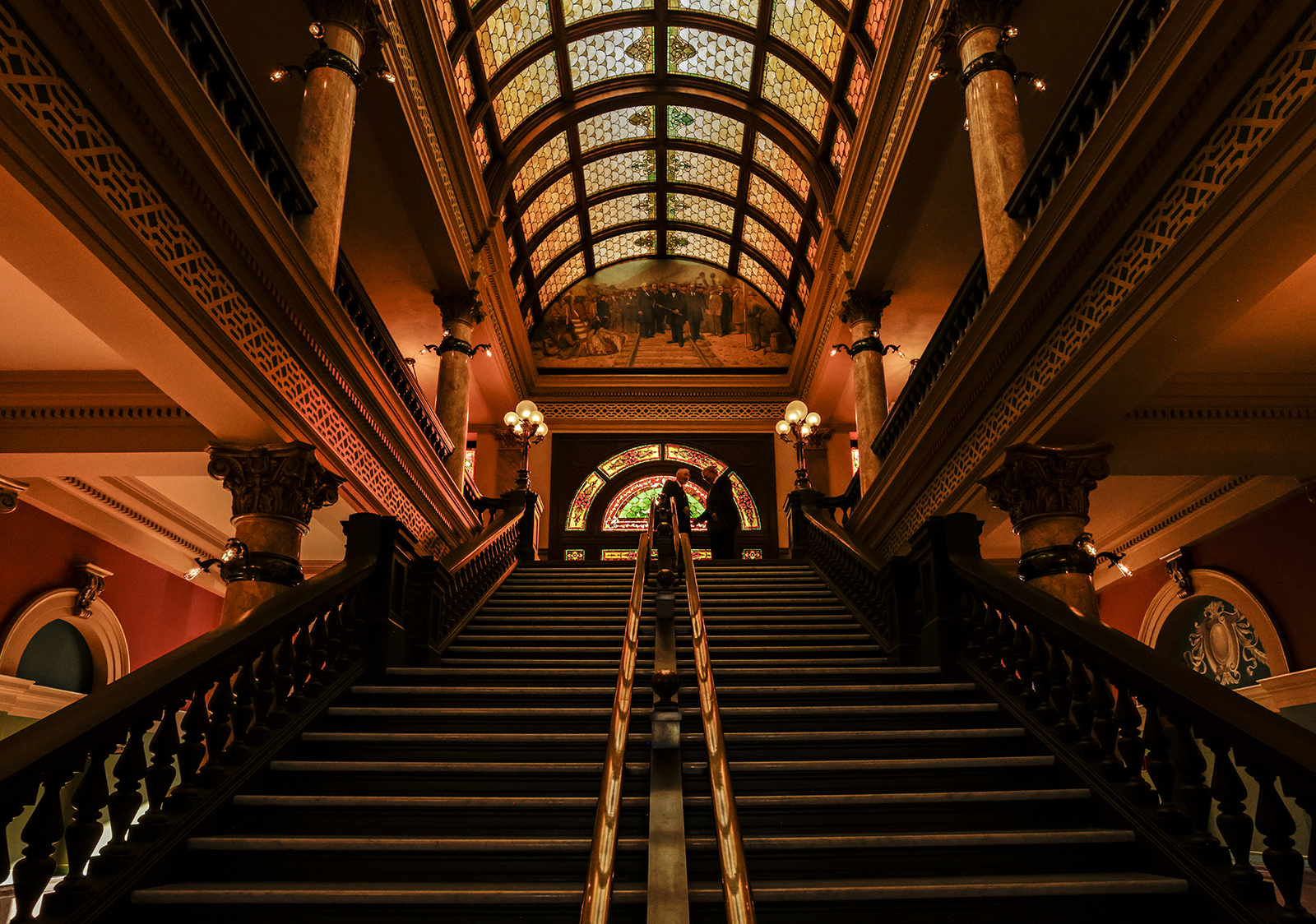 Stairway and stained glass windows in the Capitol in Helena on Jan. 16, 2025. Hunter D’Antuono | Flathead Beacon