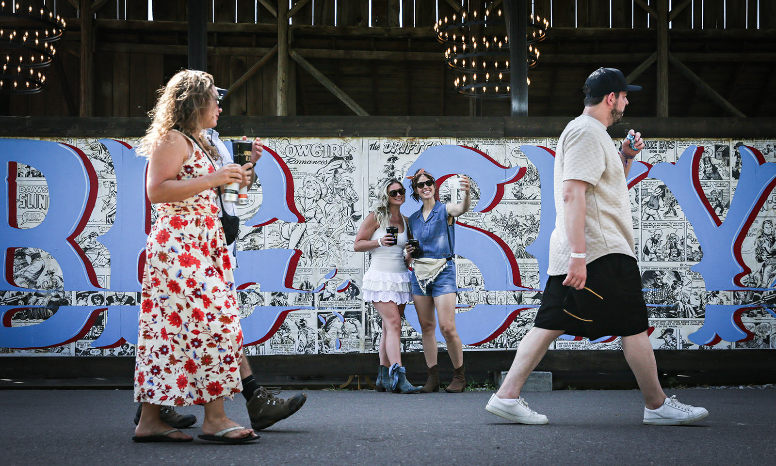 Festival-goers pose for selfies in front of a mural at Under the Big Sky music festival in Whitefish on July 18, 2025. Hunter D’Antuono | Flathead Beacon