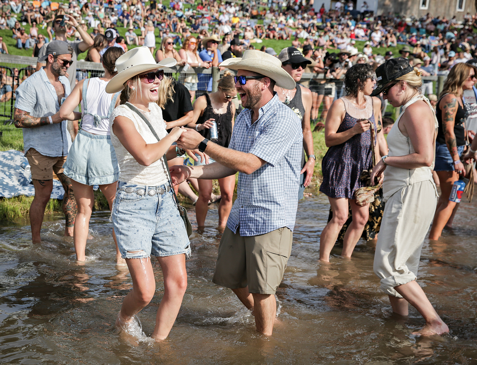 Concert-goers dance in the creek at Under the Big Sky music festival in Whitefish on July 18, 2025. Hunter D’Antuono | Flathead Beacon