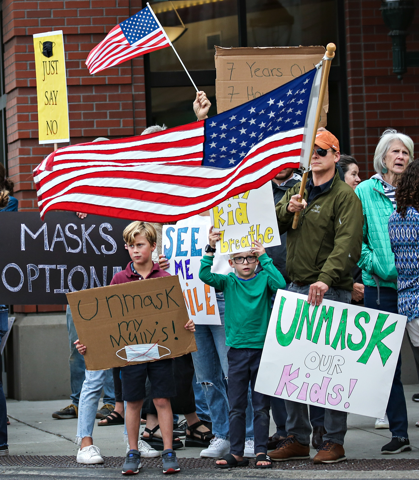 About 100 protesters gathered in downtown Whitefish on August 18, 2021 in response to the Whitefish School Board’s decision to require masks indoors for kindergarten through sixth grade students. Hunter D’Antuono | Flathead Beacon