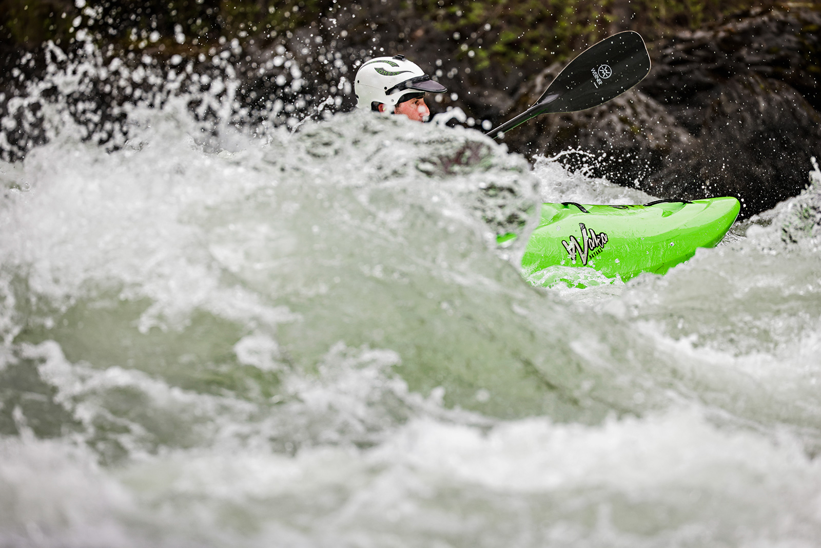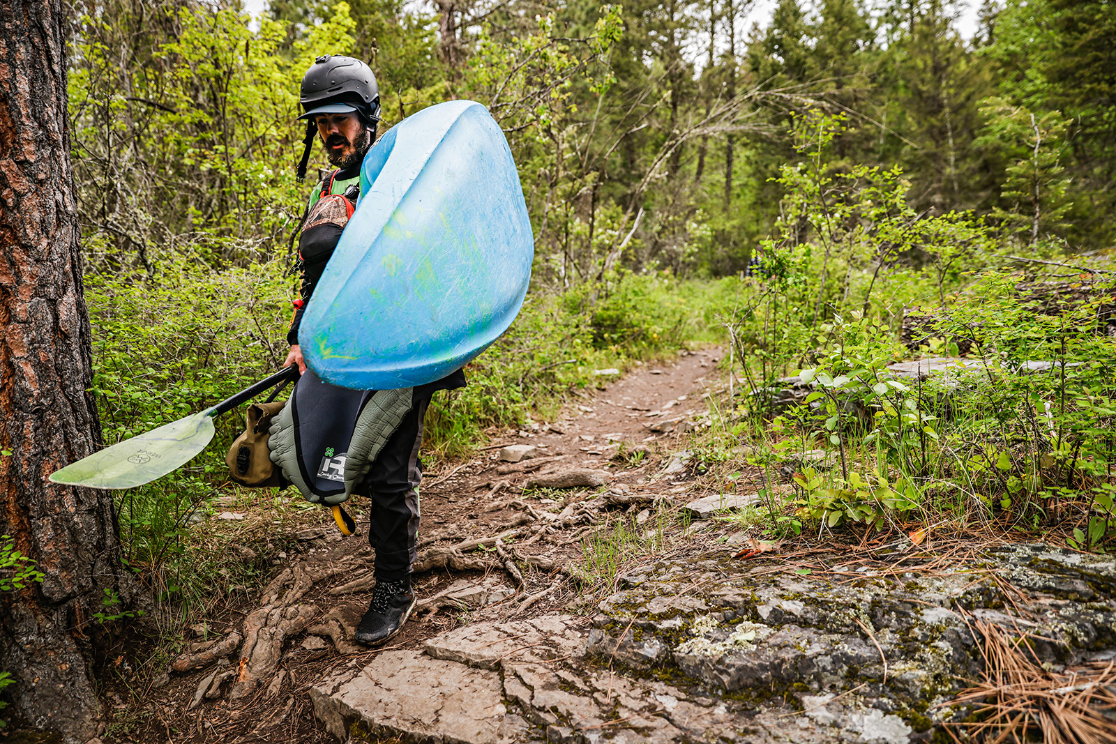 A whitewater kayaker brings their boat to the Swan River for the 47th annual The Bigfork Whitewater Festival on May 28, 2022. Hunter D’Antuono | Flathead Beacon