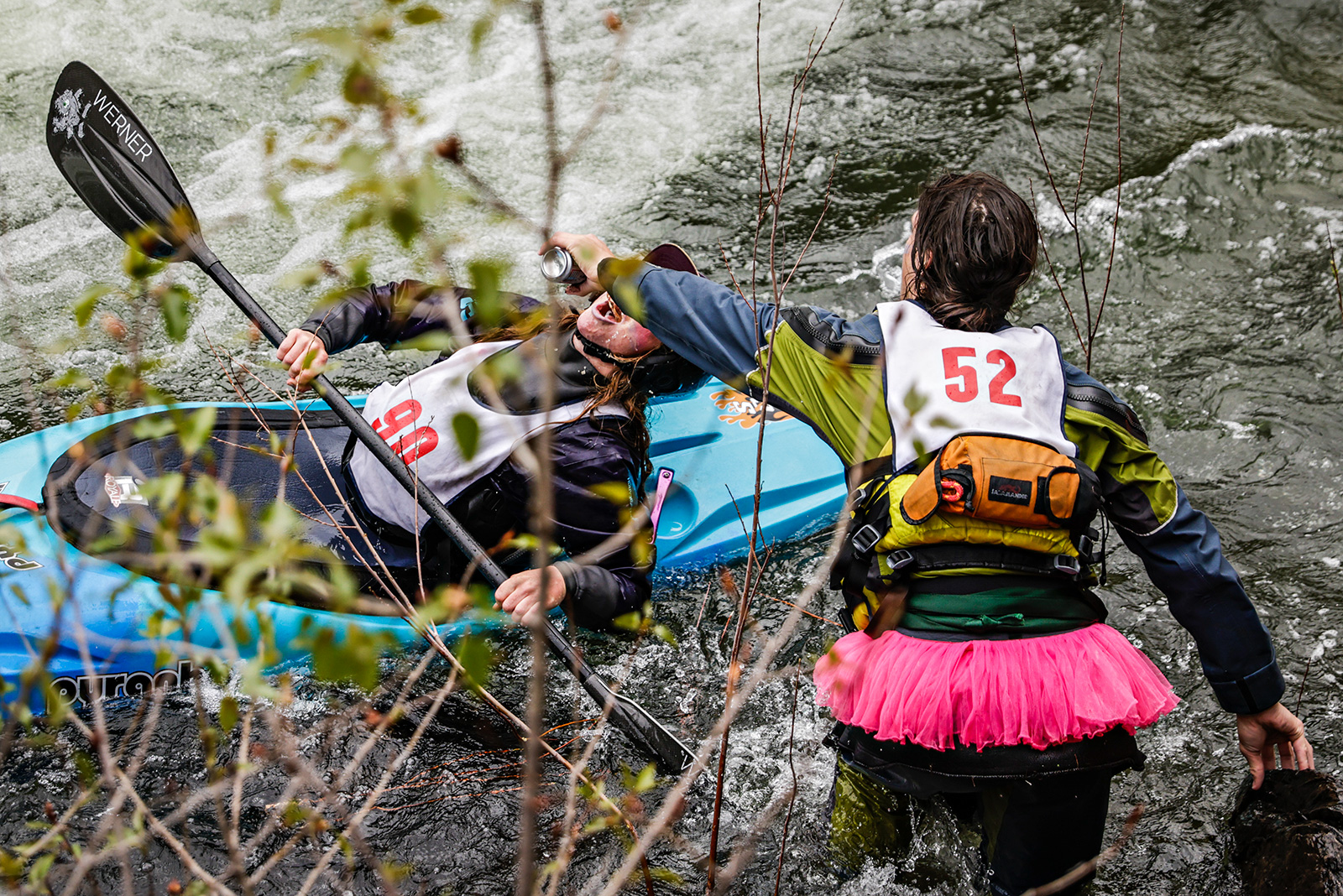A kayaker rehydrates after her run in the Expert Slalom event on the Swan River for the 47th annual The Bigfork Whitewater Festival in Bigfork on May 28, 2022. Hunter D’Antuono | Flathead Beacon