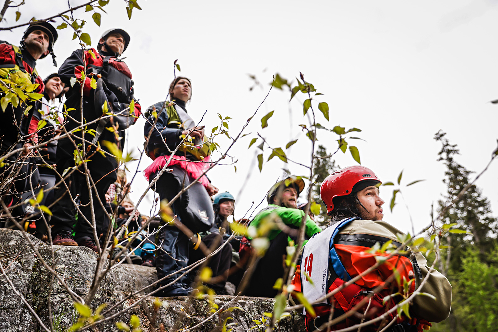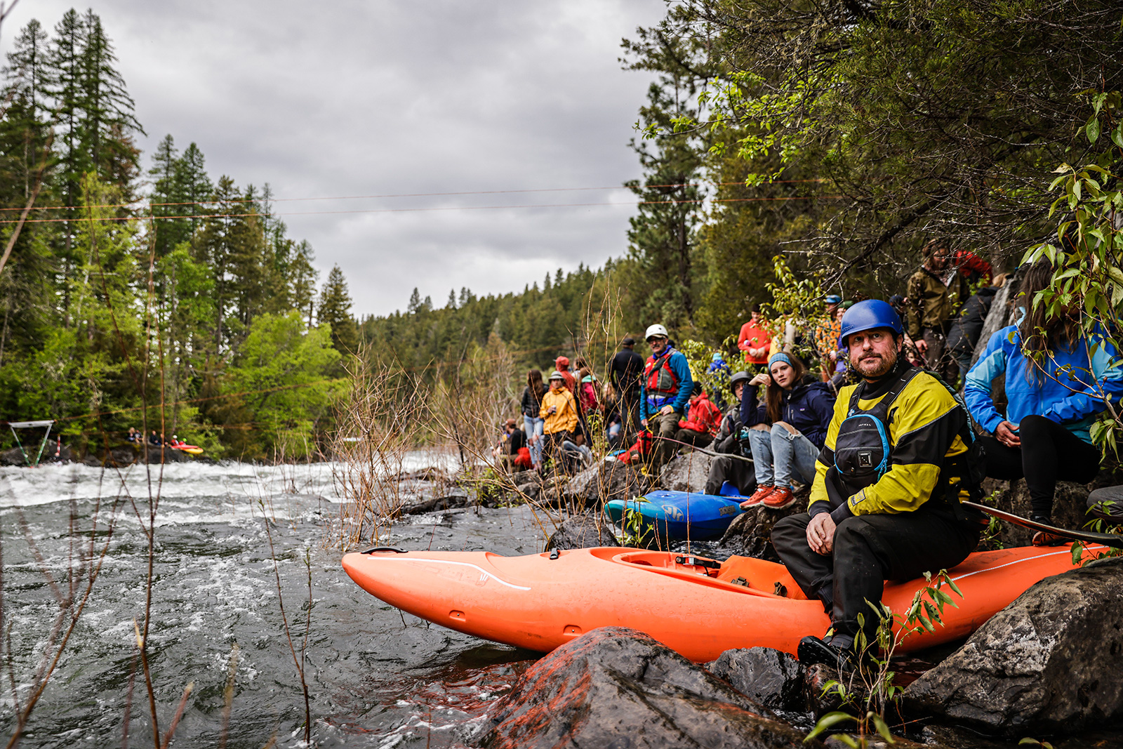 Kayakers gather on the river bank for the Expert Slalom event in the rapids of the Swan River for the 47th annual The Bigfork Whitewater Festival on May 28, 2022. Hunter D’Antuono | Flathead Beacon