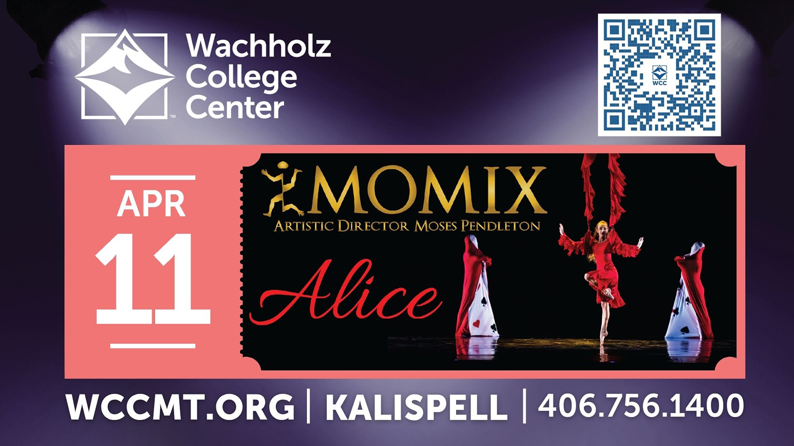 WCC is pleased to bring MOMIX: ALICE to the Flathead Valley. ALICE is a performance by MOMIX, a dance company known for illusion and acrobatics, inspired by Lewis Carroll’s Alice in Wonderland. As with every MOMIX production, you never quite know what you are going to get. Audiences will be taken on a journey that is both magical, mysterious, fun, eccentric, and much more.
